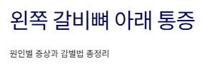 - 늑간신경통: 갈비뼈 사이를 지나는 늑간신경에 염증이나 손상이 생기면 발생합니다. 콕콕 찌르는 듯한 느낌이나 전기가 오는 듯한 찌릿한 왼쪽 갈비뼈 아래 통증이 특징이며, 숨을 깊이 들이마시거나 기침할 때 통증이 심해집니다.